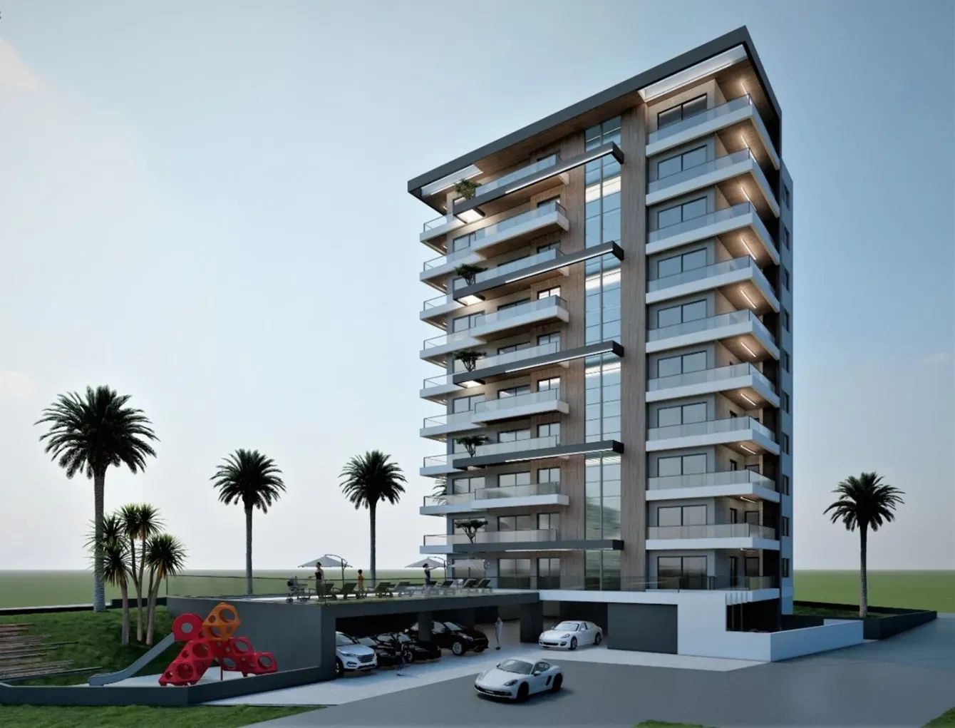 Proje sosyal donatılar açısından da zengindir. Önde konumlandırılmış yüzme havuzu, güneşlenme terası ve hemen yanında yer alan çocuk oyun alanı, aileler için keyifli vakit geçirebilecekleri sosyal yaşam alanları oluşturur. Palmiye ağaçları ve doğal peyzaj düzenlemesi ile proje, kent içinde bir tatil havası sunar.
