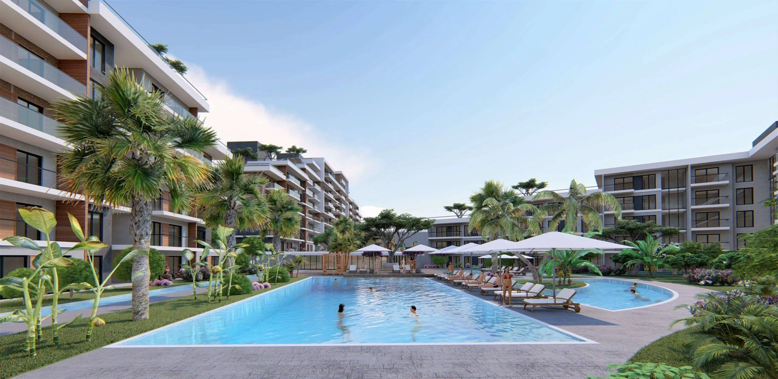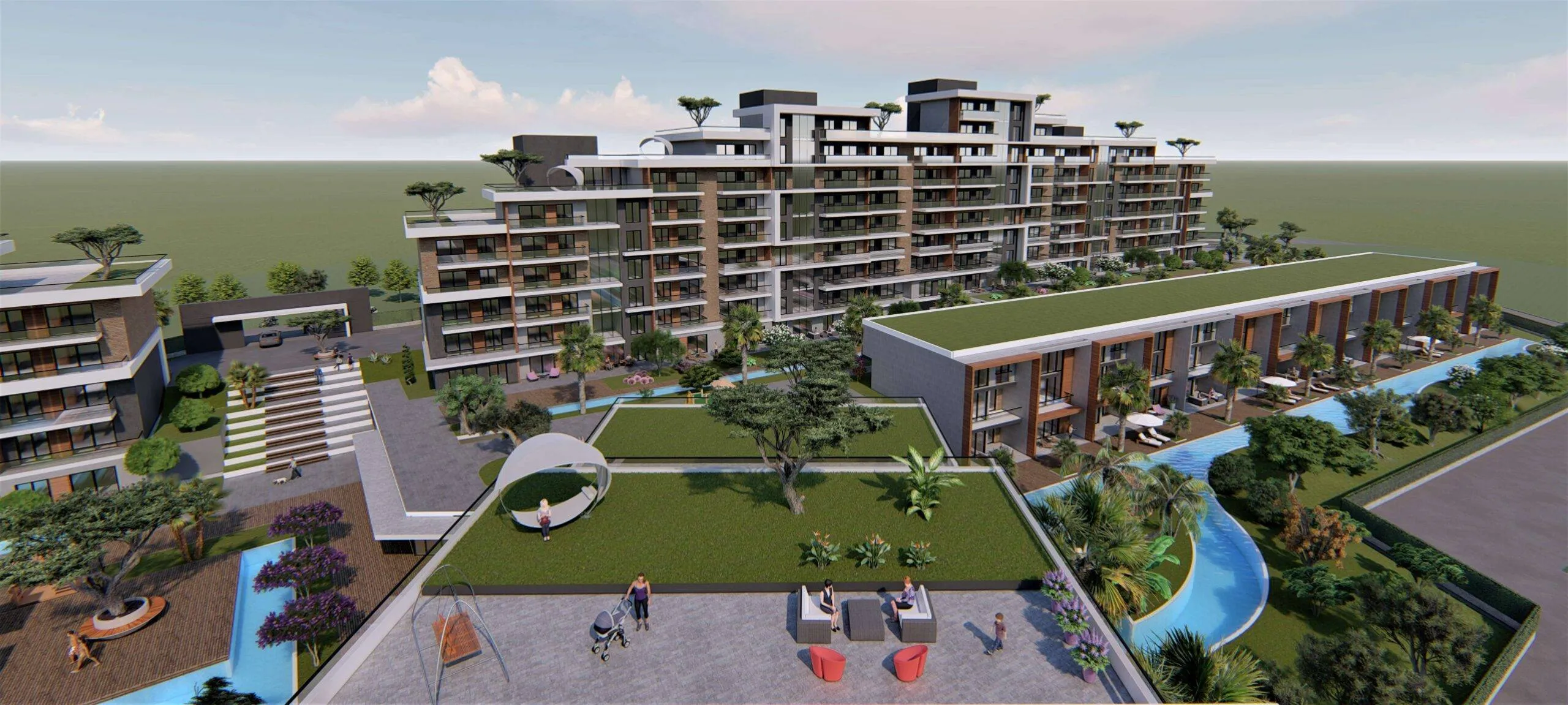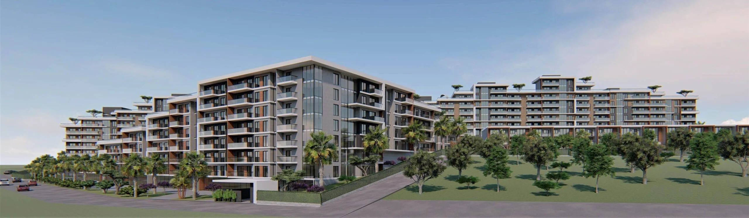 Dış cephede kullanılan doğal taş dokuları, ahşap kaplamalar ve modern tonlardaki cephe boyaları, projeye sıcak ve zarif bir görünüm kazandırıyor. Cephe ritmi, düşey ve yatay elemanların dengeli kullanımıyla dikkat çekici bir bütünlük içinde tasarlanmış. Teras katlarında yer alan peyzajlı çatılar ve özenle seçilmiş bitkilendirme unsurları, projeye yeşille iç içe bir karakter kazandırırken sürdürülebilirlik anlayışına da katkı sağlıyor. Palmiyeler ve form verilmiş ağaçlarla zenginleştirilen çevre düzenlemesi, Akdeniz esintisini modern mimariyle buluşturuyor. Zemin katta yer alan ticari alanlar ise cam vitrinlerle hem estetik hem de işlevsel bir kent dokusu sunuyor.