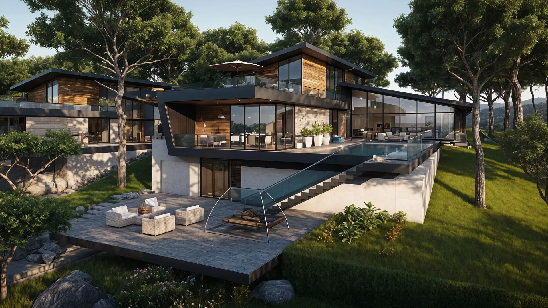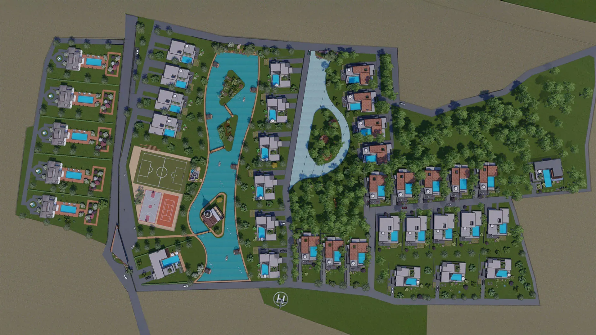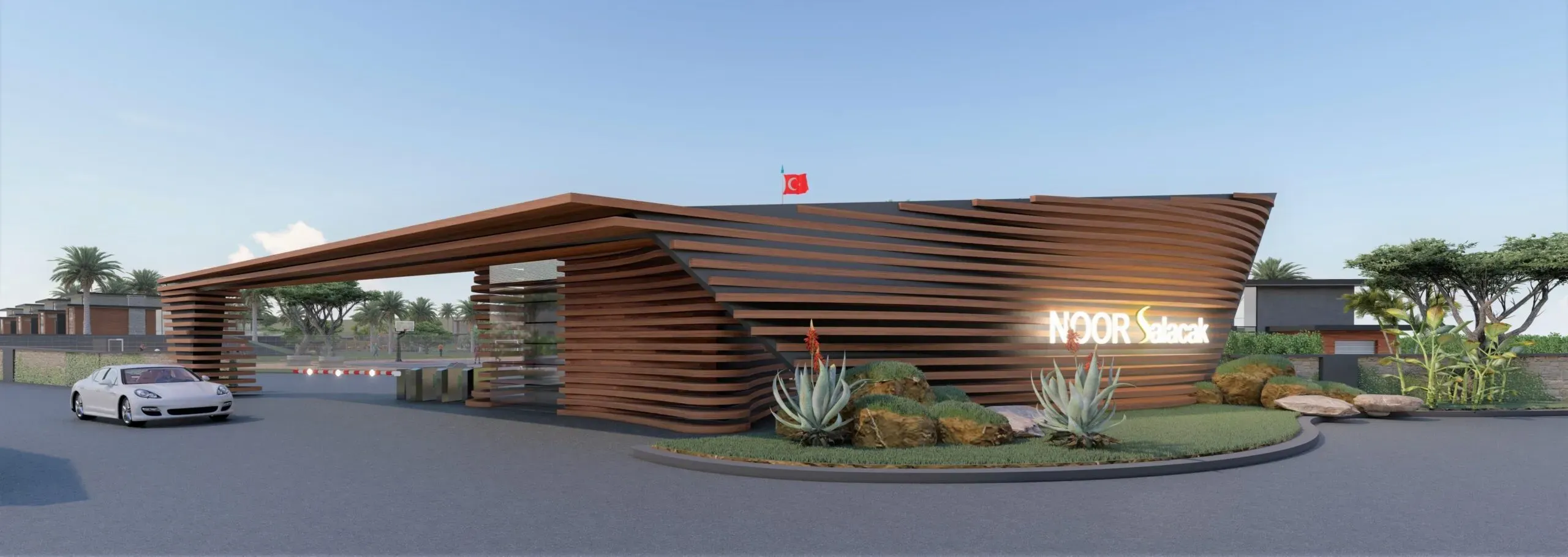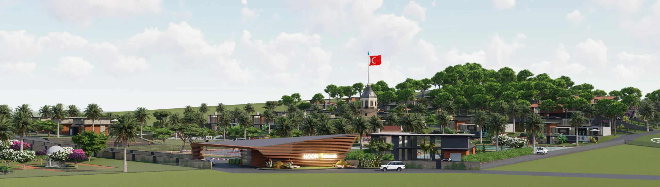 Noor Kekliktepe'nin dış cephesi, modern mimarinin zarif çizgilerini doğal çevreyle uyum içinde yansıtıyor. Geniş teraslar ve balkonlar, Kekliktepe'nin eşsiz manzarasının tadını çıkarmanız için tasarlandı. Site içerisindeki peyzaj düzenlemesi, yeşil alanlar ve doğal dokuyu koruyarak huzurlu bir ortam yaratıyor. Görüntülerden anlaşıldığı üzere, proje içerisinde spor sahaları ve su kanalları gibi sosyal olanaklar da bulunuyor, bu da site yaşamına ayrı bir değer katıyor.